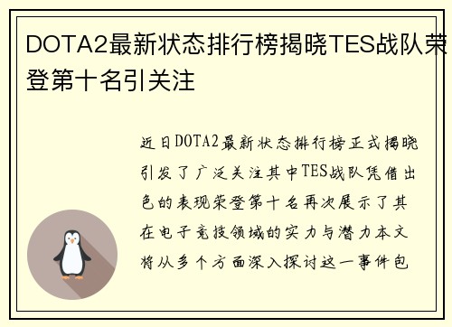 DOTA2最新状态排行榜揭晓TES战队荣登第十名引关注